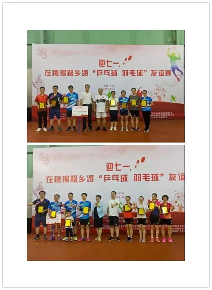 2019年6月29日,在“‘迎七一’在穗揭籍乡贤乒乓球、羽毛球友谊赛”参赛的七支队伍中,我会乒乓球队、羽毛球队实力超群,双双获得团体亚军。