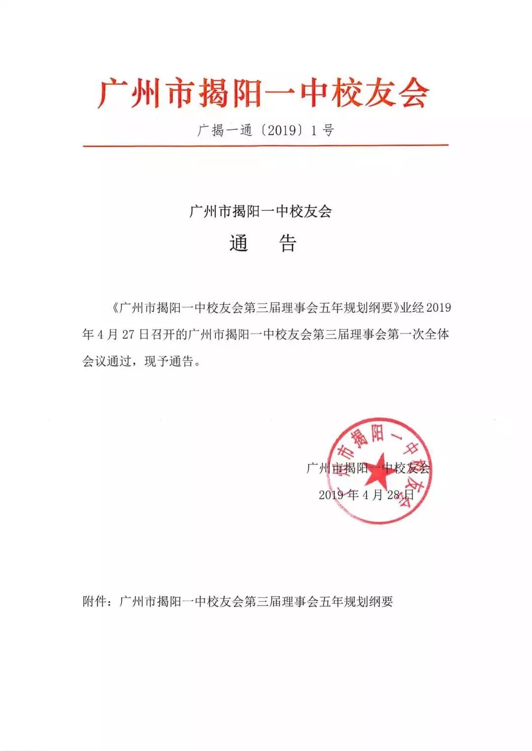 2019年4月30日,我会第三届理事会向在穗校友公布四项文件,包括《广州市揭阳一中校友会第三届理事会五年规划纲要》《广州市揭阳一中校友会理事会会议制度》《广州市揭阳一中校友会关于表彰2018年度热心校友的决定》和《广州市揭阳一中校友会会员会费缴纳办法》。
