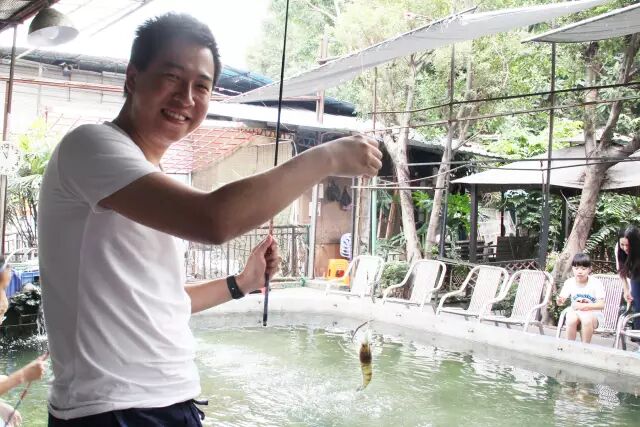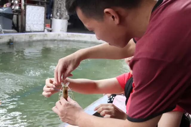 看着师兄师姐们陆续钓上了大虾,校友会秘书处92届谢创锋校友干脆扔下自己空空的钓杆,拿起单反相机当起了摄影师。不过随后他又发现了自己的一项新技能——拆虾。只见他一手拿着钓钩,一手捏住虾身,轻轻一转,一只上了钩的大虾就被拆了出来,扔到虾网里还在活蹦乱跳。一技在身,谢创锋开始忙碌起来,他穿梭于整个虾池间,为有需要的校友拆虾,因此被校友们笑称为“拆虾小王子”。