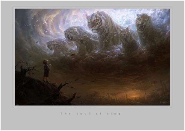 譬如作品《王魂》,它的理念是这样的:“未来世界中,有一个叫库塔的小男孩,从小非常喜欢猫科动物,在他6岁生日,爸爸妈妈送了他一只小猫,让他爱不释手。不过他心里还有更大、但似乎不可能实现的愿望——亲眼看看大型野生猫科动物。可是,这个时代里,老虎、雪豹、云豹、猞猁、金猫等大型猫科动物早已灭绝,这令库塔非常失望。某天下午,库塔带着小猫到郊区的小山坡玩,黄昏落日下,他站在高坡处仰望天空,看着天空的团团火烧云,库塔以异于大人的想象力,仿佛看到了天际上,百兽之王老虎的亡魂,威风凛凛地率领着大猫们,回来到了地球……”作品以后代人类小孩侧面入手,让虚幻的大猫与现实的小猫形成生物关联,再让远处高科技现代城市与野生动物形成讽刺性对比,唤醒人们对野生动物濒临灭绝的危机感。