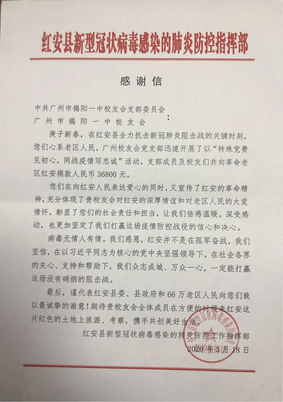 4月3日,在校友会办公室上班的党支部书记谢少波(57届),接到了“红安县新型冠状病毒感染的肺炎防控指挥部”寄来的感谢信,他读了一遍又一遍。2月6日,在抗击疫情枪声打响时,校友会党支部第一时间组织全体党员自愿缴交特殊党费,定点捐给革命老区湖北省红安县。在黄东生会长及理事会、广州通巴达电气科技有限公司、杰创智能科技有限公司、企业界及广大校友的关心支持下,我会共为红安捐款202366.4元。据不完全统计,我会会员通过各种渠道捐款接近200万元用于各地抗疫。在谈到与红安的缘份时,谢少波说:“红安是革命老区,大革命时期,诞生了红四方面军、红二十五军、红二十八军三支红军主力。牺牲了14万英雄儿女,在册革命烈士就有22552人,牺牲之多、贡献之大,全国罕见。诞生了董必武、李先念两位国家主席和陈锡联、韩先楚、秦基伟等223位将军。在疫情肆虐之时,当老区人民看到一个很远的地方,很微小的、很基层的党组织,用很微小的捐款表达温暖时,会让他们想到上级党组织一定记挂着他们。我们小小支部做不了大事,就做点小事。”