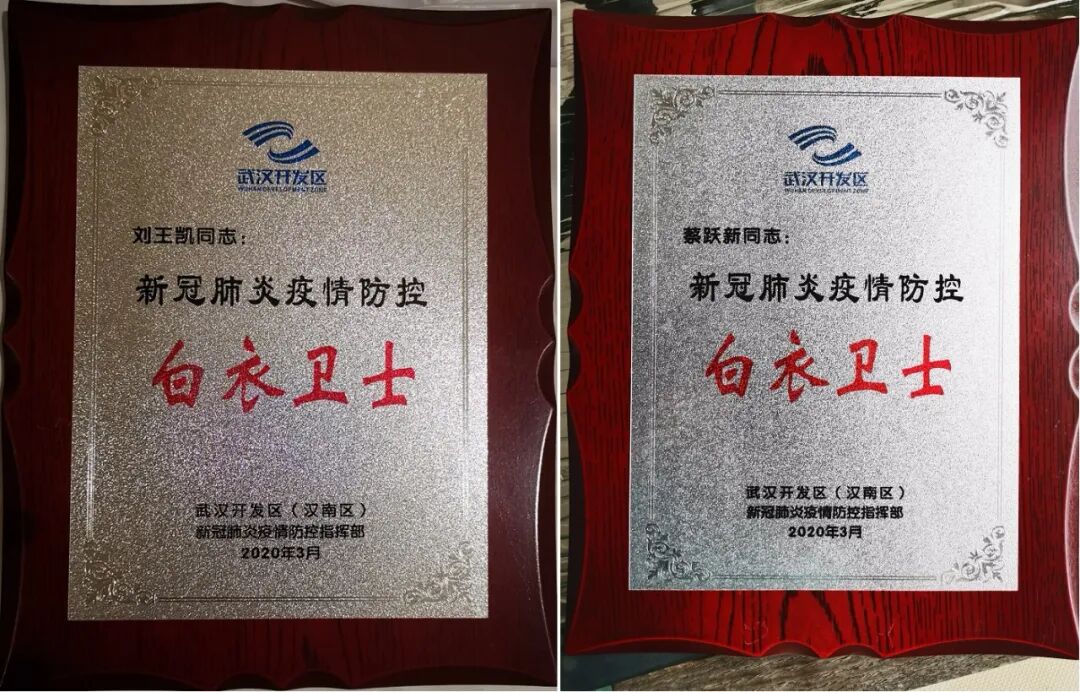 武汉开发区为刘王凯、蔡跃新医生颁发荣誉牌匾