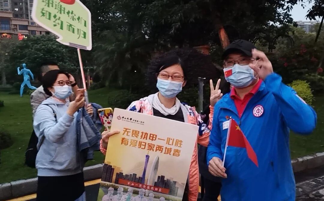 3月25日晚上,广州塔,为勇敢者亮起了名字。“看到他的名字点亮夜空,心中有许多感慨。他践行了当初许下的‘医学生誓言’,我为他自豪,也盼他顺利完成任务,早日回家团圆!”看到仍然在武汉战“疫”的丈夫、中山一院儿科医生刘王凯(76届)的名字闪耀在广州塔上,中山一院眼科医生苏毅华感慨地说。而今天(4月7日)如苏毅华医生所愿,刘王凯医生在武汉协和医院战疫60天后凯旋归来,苏医生赶到隔离休整地迎接丈夫。