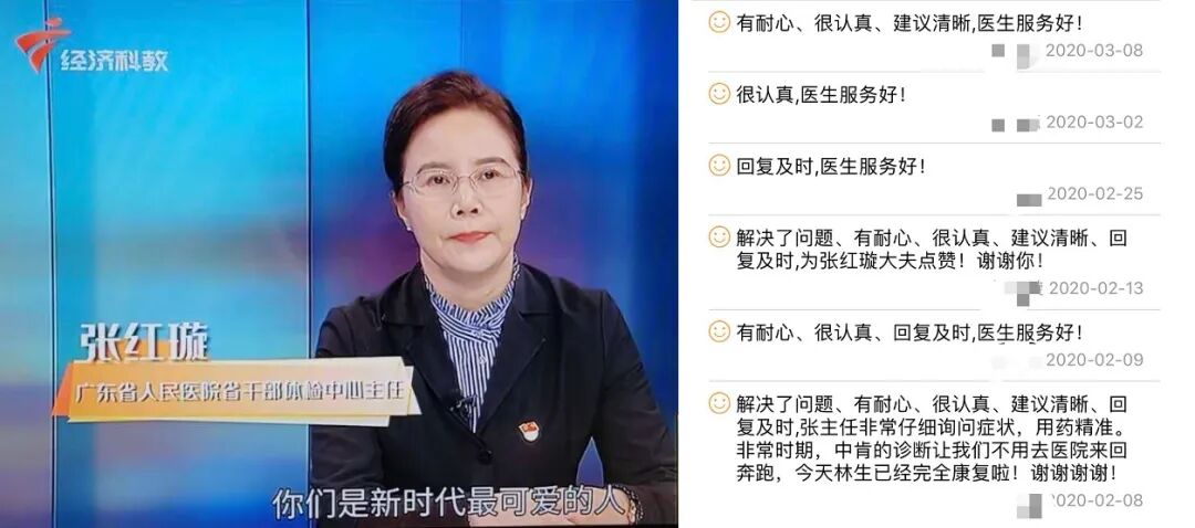 “疫情初期,不少有呼吸道感染疾病的患者很恐慌、有一点不舒服就担心自己是不是得了新冠肺炎,滋生焦虑情绪,我们提供了专业的咨询服务来让患者放心。”张红璇教授(61届)——广东省人民医院广东省干部体检中心主任、呼吸科专家,积极参与“抗击疫情 我在行动”义诊活动,帮助患者尤其是患有呼吸道疾病的患者解疑答惑,累计在线接诊患者411位。她还受广东广播电视台邀请,在经济科技频道录制特别节目《科学防治 守望胜利》。